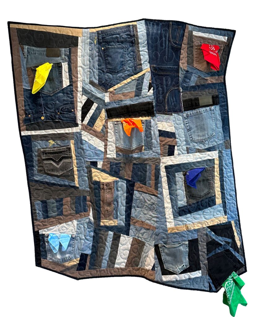 Others work through colour and design, their messages conveyed in titles like, “Even if Your Voice Shakes,” or “1971, Before We Could Ask” (pictured right). The latter is a stunning integration of recognizable elements: a collection of denim back pockets with colourful handkerchiefs hanging out—an important code in a time when expressing desire could be deadly. That it breaks the expectations of a “quilt” heightens the tragedy it records.