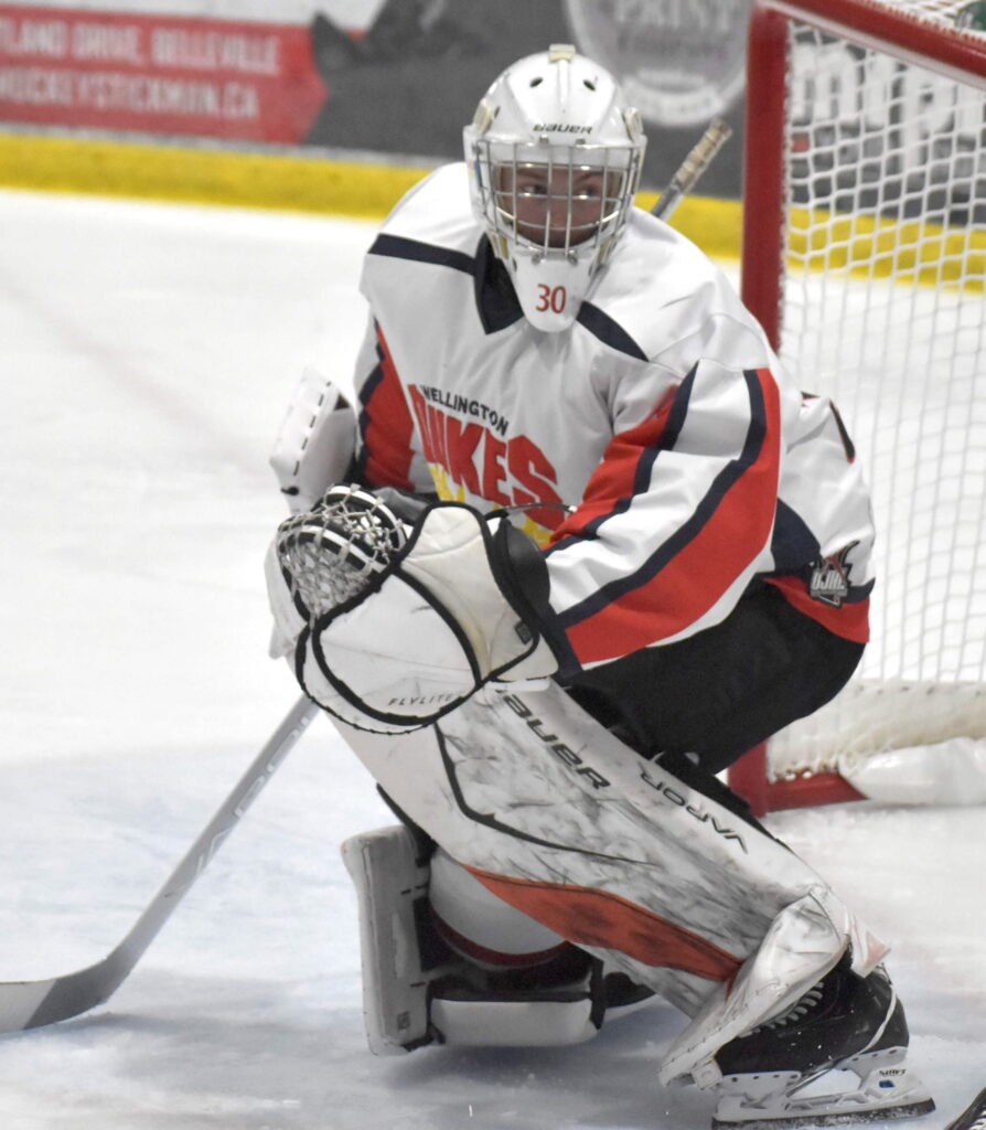 The host Dukes blanked the visiting Cats Sunday night 3-0. Wellington netminder Dryden Reilly was perfect, denying Pickering shooters on all 43 volleys they sent the Trenton, ON native’s way.