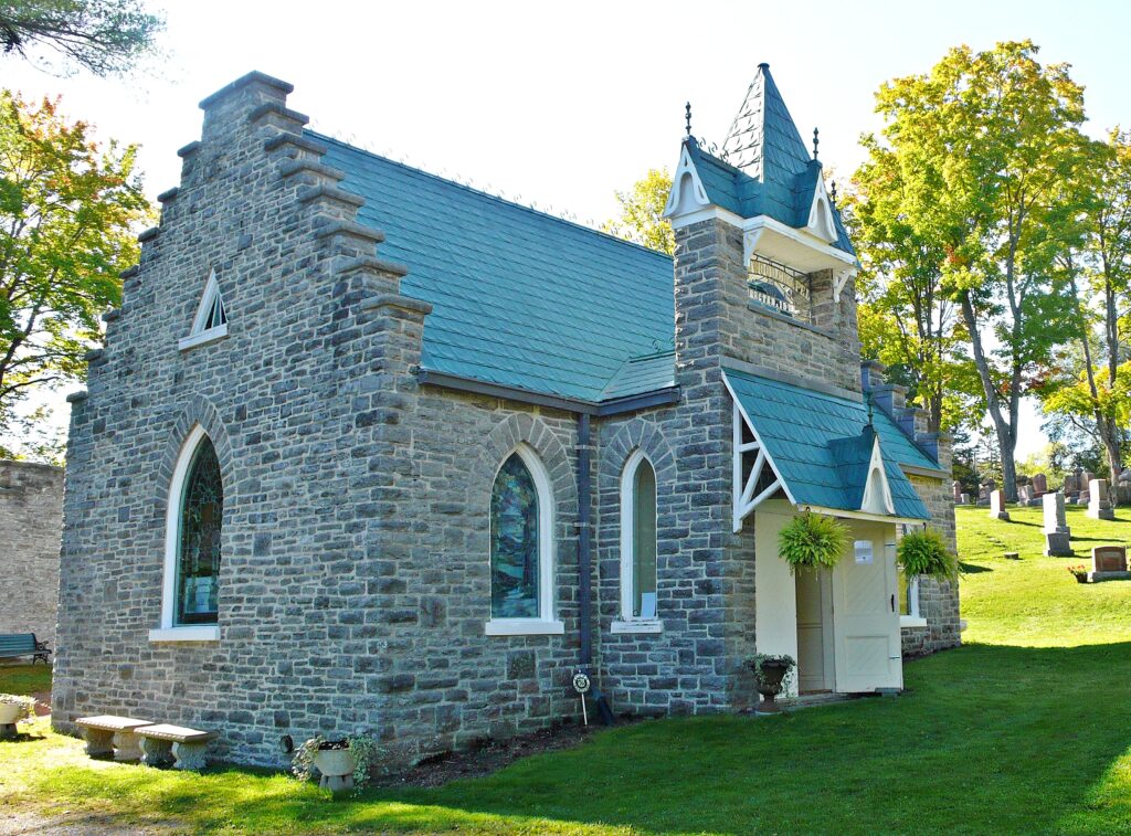 The chapel was built in 1901, designed by local builder Frank T. Wright, who also built Picton’s Crystal Palace at the Fairgrounds. The chapel windows are distinctive. Rather than the usual Christian imagery, all the windows were donated by Prince Edward County’s secret societies, and are embellished with their symbols.