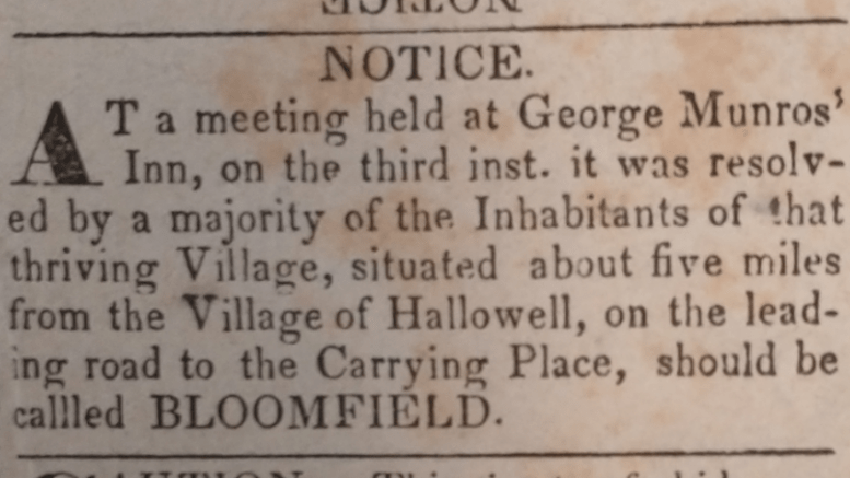 “NOTICE. AT a meeting held at George Munros’ Inn, on the third inst. it was resolved by a majority of the Inhabitants of that thriving Village, situated about five miles from the Village of Hallowell, on the leading road to the Carrying Place, should be called BLOOMFIELD.”