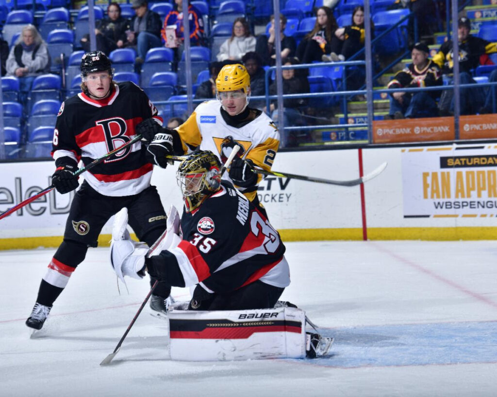 In Eastern Pennsylvania’s Electric City to kick off the road trip, the Senators capitalized from the speed of Xavier Bourgault. From a defensive zone faceoff, the L’Islet, QC native burst up the ice to a loose puck and beat Pens starter Joel Blomqvist five hole with 2:36 left in the first.
