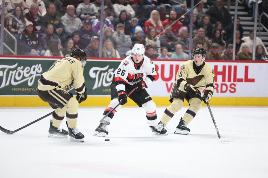 On Saturday, former Senator defenceman Wyatt Bongiovanni pushed Hershey ahead 2-1 with a goal in the second but the visitors pulled away with a three goal outburst in the middle frame.